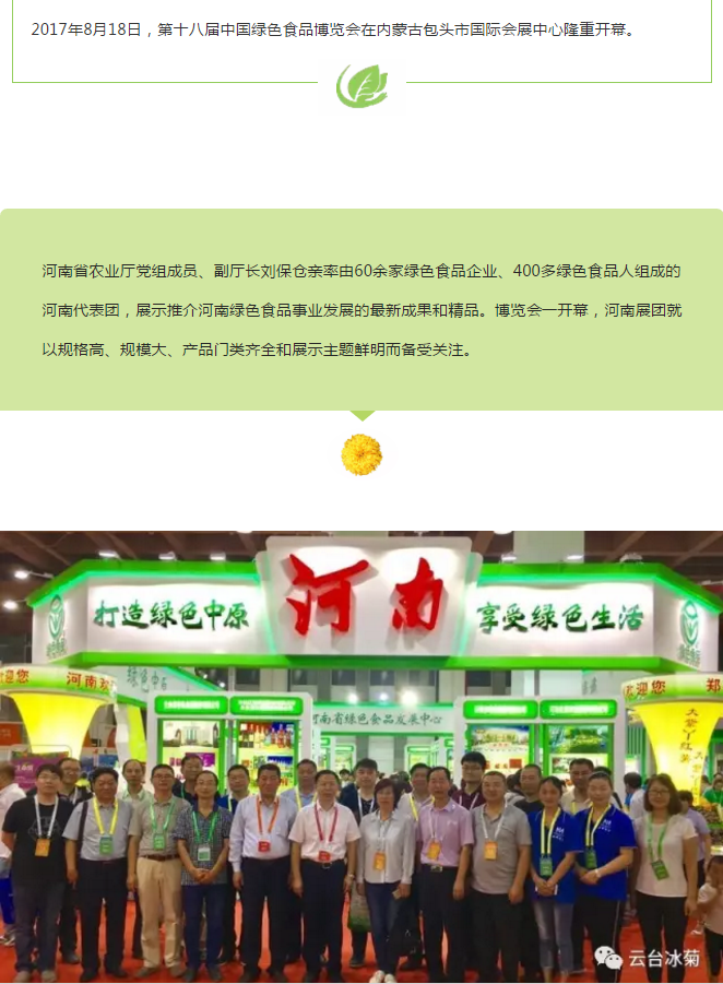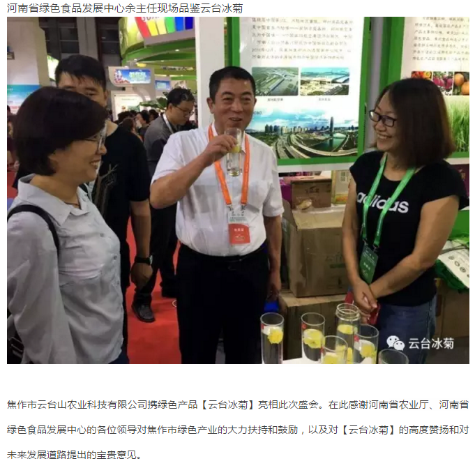 云臺冰菊不僅凸顯了河南綠色食品大家族、新發(fā)展和新形象,也為本屆博覽會“綠色理念、綠色生產(chǎn)、綠色消費”主題貢獻了一己之力,受到蒞會領導、廣大市民、國內(nèi)外客商和各類媒體的廣泛關注和高度稱贊。