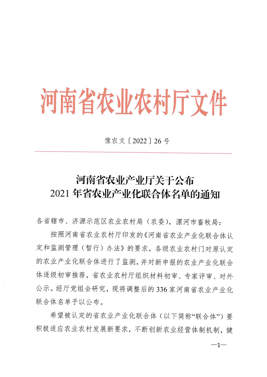 河南省農(nóng)業(yè)農(nóng)村廳關于公布2021年省農(nóng)業(yè)產(chǎn)業(yè)化聯(lián)合體名單的通知